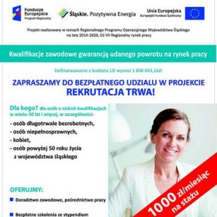 Zapraszamy do zapoznania się z informacjami na temat projektu realizowanego w ramach Regionalnego Programu Operacyjnego Województwa Śląskiego na lata 2014-2020, Oś VII Regionalny rynek pracy, działanie: 7.1. Aktywna forma przeciwdziałania bezrobociu dla poddziałania 7.1.3. Poprawa zdolności do zatrudnienia osób poszukujących pracy i pozostających bez zatrudnienia oraz jest współfinansowany ze środków UE – Europejskiego Funduszu Społecznego. Czytaj więcej „Kwalifikacje zawodowe gwarancją udanego powrotu na rynek pracy”