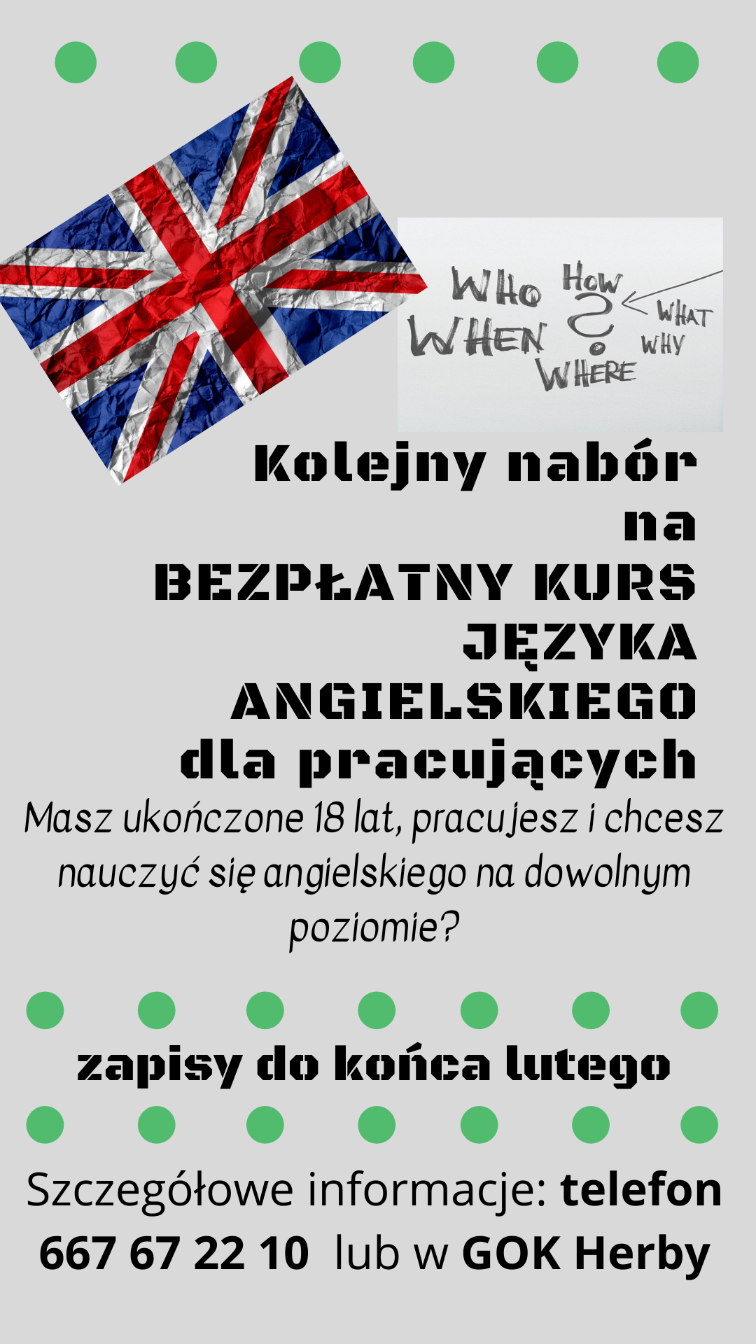 Jeśli masz skończone 18 lat, pracujesz i chcesz nauczyć się angielskiego od podstaw zapraszamy na kolejny, bezpłatny kurs angielskiego dla pracujących. Zapisy do końca lutego. Szczegóły pod numerem telefonu: 667 672 210 lub w GOK Herby.