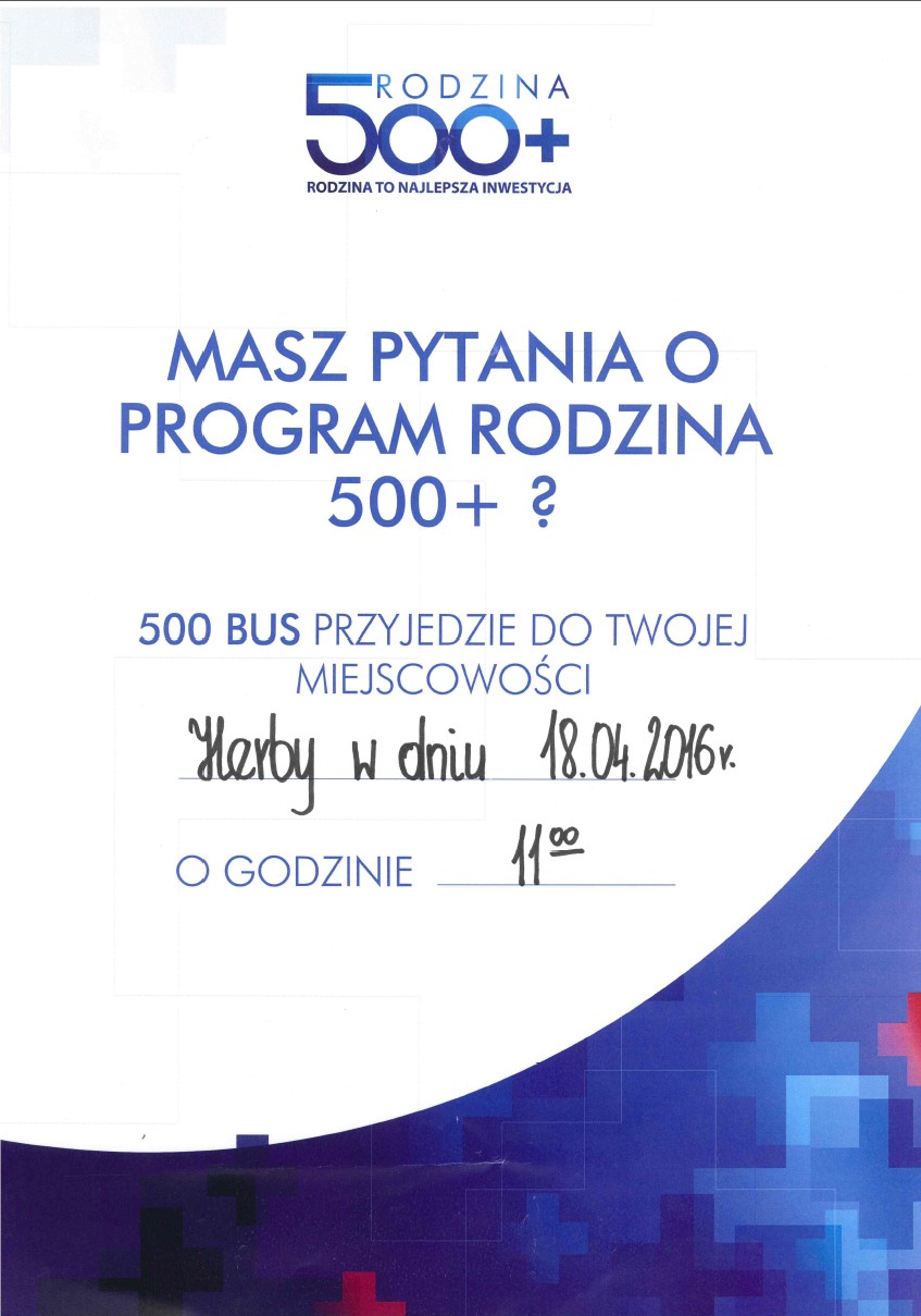 W dniu 18 kwietnia br pod Urzędem Gminy pojawi się „500 bus“, czyli rządowy, mobilny punkt pomocy przy realizacji programu „Rodzina 500+“. Busy wraz z rozpoczęciem realizacji programu wyjechały na drogi całej Polski. Są widoczne z daleka, oklejono je bowiem niebieskimi emblematami i logo programu.