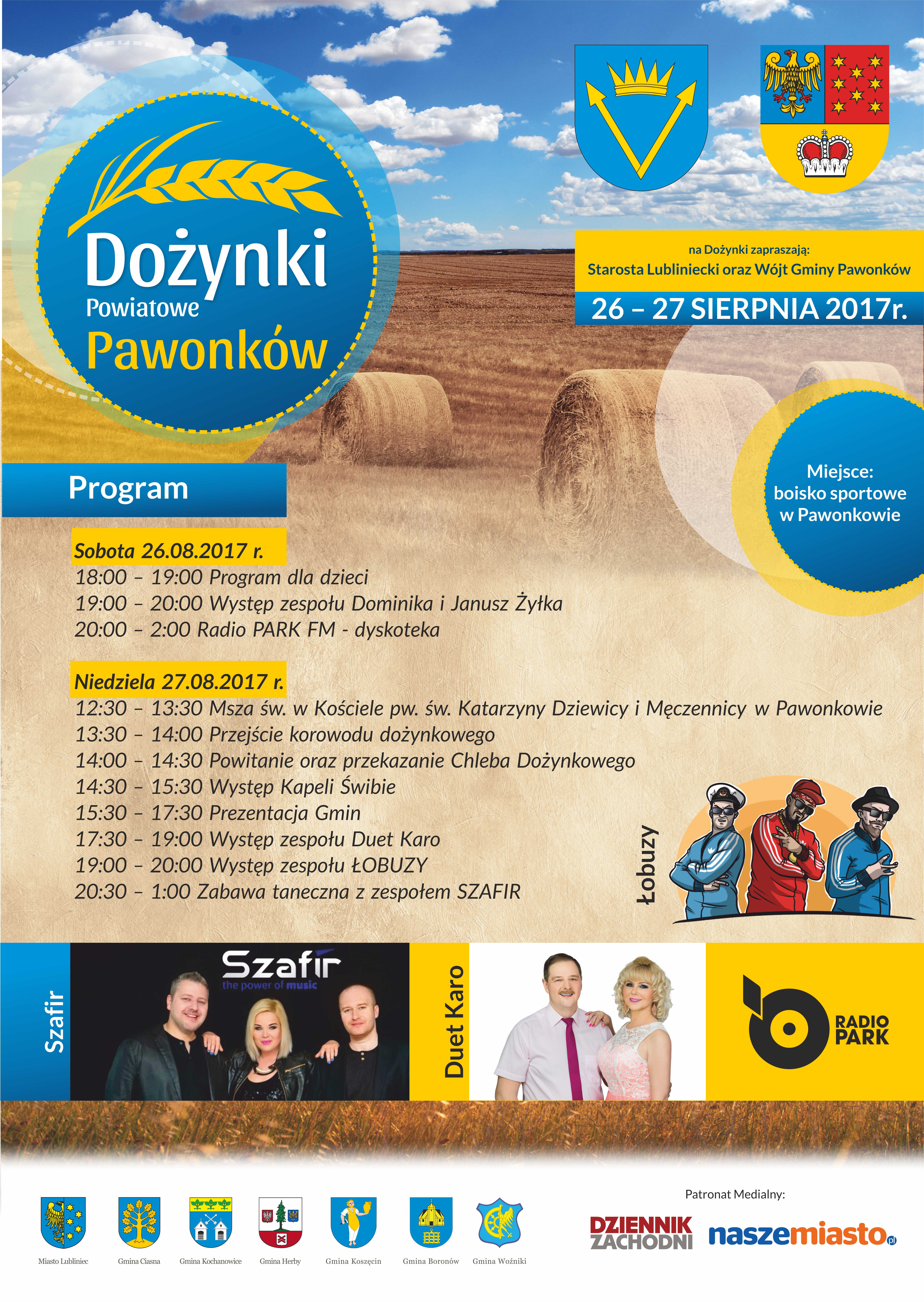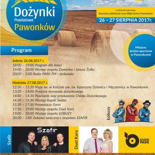 Starosta Lubliniecki oraz Wójt Gminy Pawonków zapraszają na Dożynki Powiatowe, które odbędą się w dniach 26-27 sierpnia br.