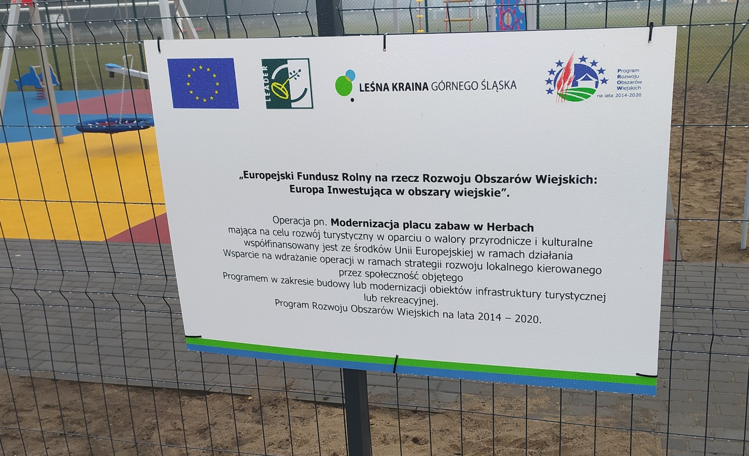 Dzięki dofinansowaniu z Europejskiego Funduszu Rolnego na rzecz Rozwoju Obszarów Wiejskich: „Europa Inwestuje w obszary wiejskie” uzyskanego w wyniku konkursu ogłoszonego przez Stowarzyszenie Lokalna Grupa Działania „Leśna Kraina Górnego Śląska” w ramach poddziałania 19.2 „Wsparcie na wdrażania operacji w ramach strategii rozwoju lokalnego przez społeczność” objętego Programem Rozwoju Obszarów Wiejskich na lata 2014 – 2020, Gmina Herby zrealizowała zadanie pn. „Modernizacja placu zabaw w Herbach”. Modernizowany plac zabaw jest ogólnodostępny dla wszystkich mieszkańców gminy. W jego skład wchodzą urządzenia takie jak: zestaw zabawowy, piramida linowa, ścianka wspinaczkowa potrójna, karuzela tarczowa z siedziskiem, bujaki sprężynowe, huśtawki wahadłowe oraz huśtawki z siedziskami dostosowanymi do dzieci w różnym wieku. W celu zapewnienie komfortu i bezpieczeństwa użytkowników pod urządzeniami zabawowymi zastosowano bezpieczne podłoże poliuretanowe.
