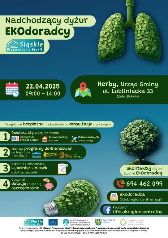 Zapraszamy serdecznie na nadchodzący dyżur ekodoradcy, który odbędzie się 22 kwietnia 2025r. w godzinach 9:00 – 14:00. Ekodoradca będzie dostępny dla mieszkańców na parterze budynku (poczekalnia sali ślubów) Urzędu Gminy w Herbach przy ul. Lublinieckiej 33.