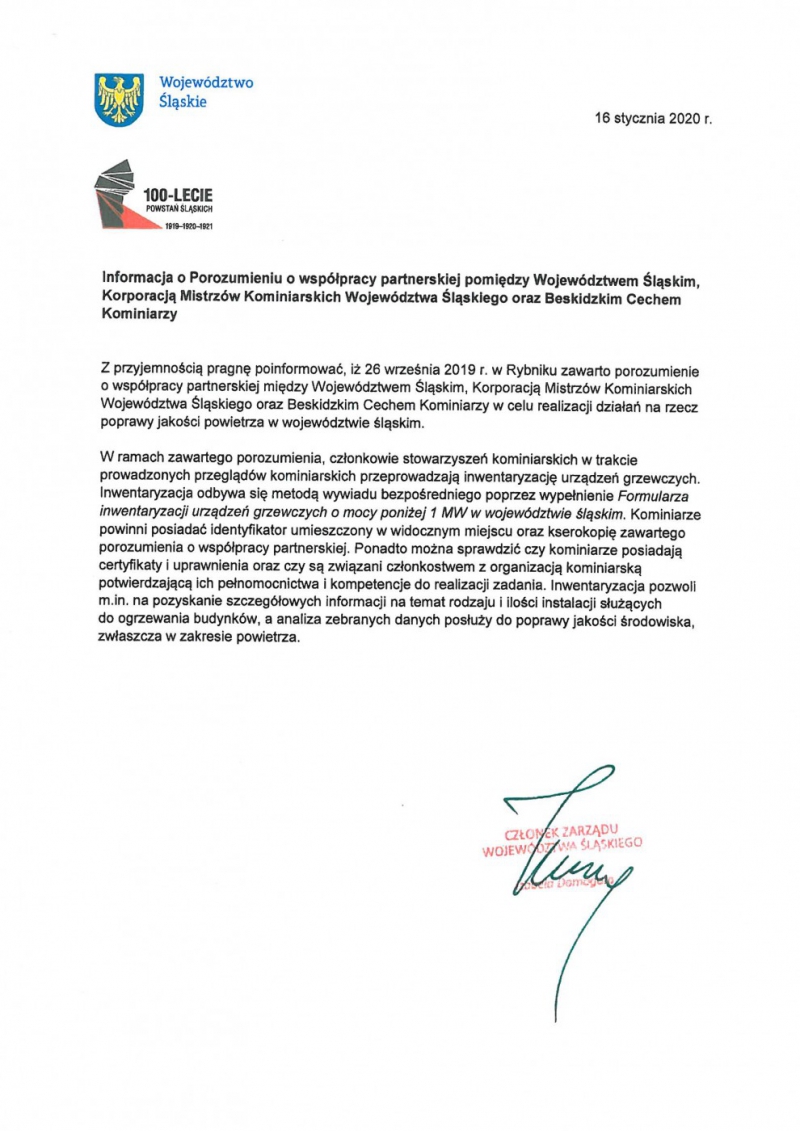Informacja o Porozumieniu o współpracy partnerskiej pomiędzy Województwem Śląskim, Korporacją Mistrzów Kominiarskich Województwa Śląskiego oraz Beskidzkim Cechem Kominiarzy: