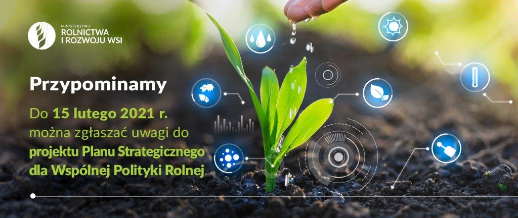 Ministerstwo Rolnictwa i Rozwoju Wsi przypomina, że do 15 lutego 2021 r. można zgłaszać uwagi do projektu Planu Strategicznego dla Wspólnej Polityki Rolnej.
