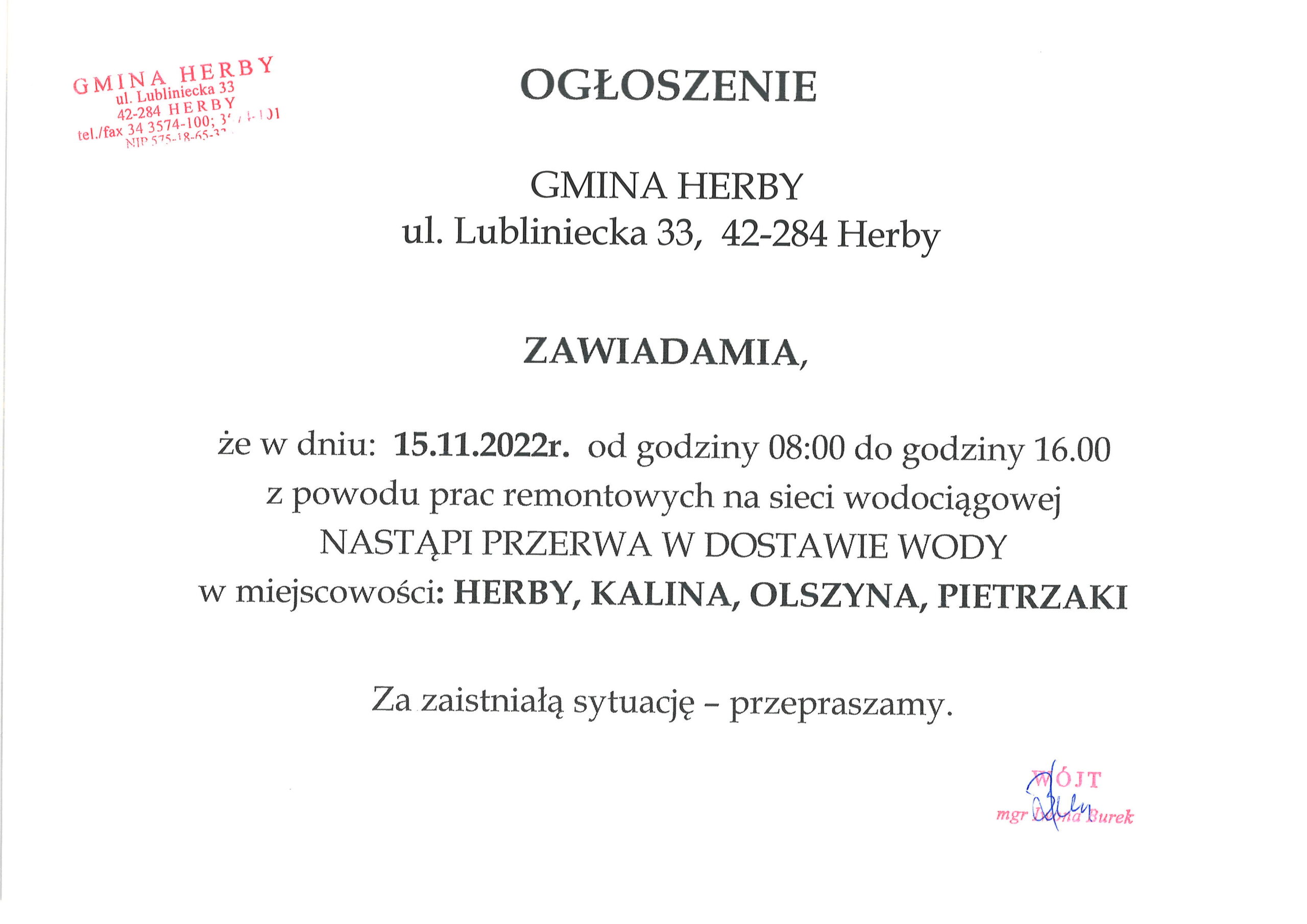 Gmina Herby zawiadamia, że w dniu 15.11.2022r. od godziny 8:00 do godziny 16:00 z powodu prac remontowych na sieci wodociągowej nastąpi przerwa w dostawie wody w miejscowości: Herby, Kalina, Olszyna, Pietrzaki.