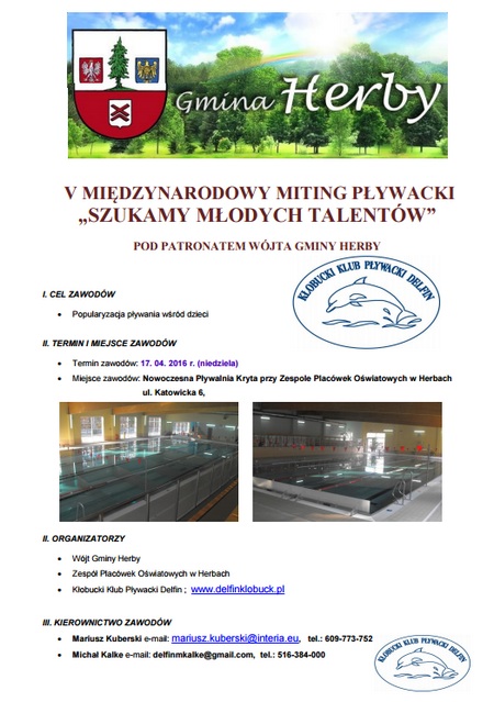 Gmina Herby oraz Delfin Kłobuck zapraszają na V Międzynarodowy Miting Pływacki „SZUKAMY MŁODYCH TALENTÓW”