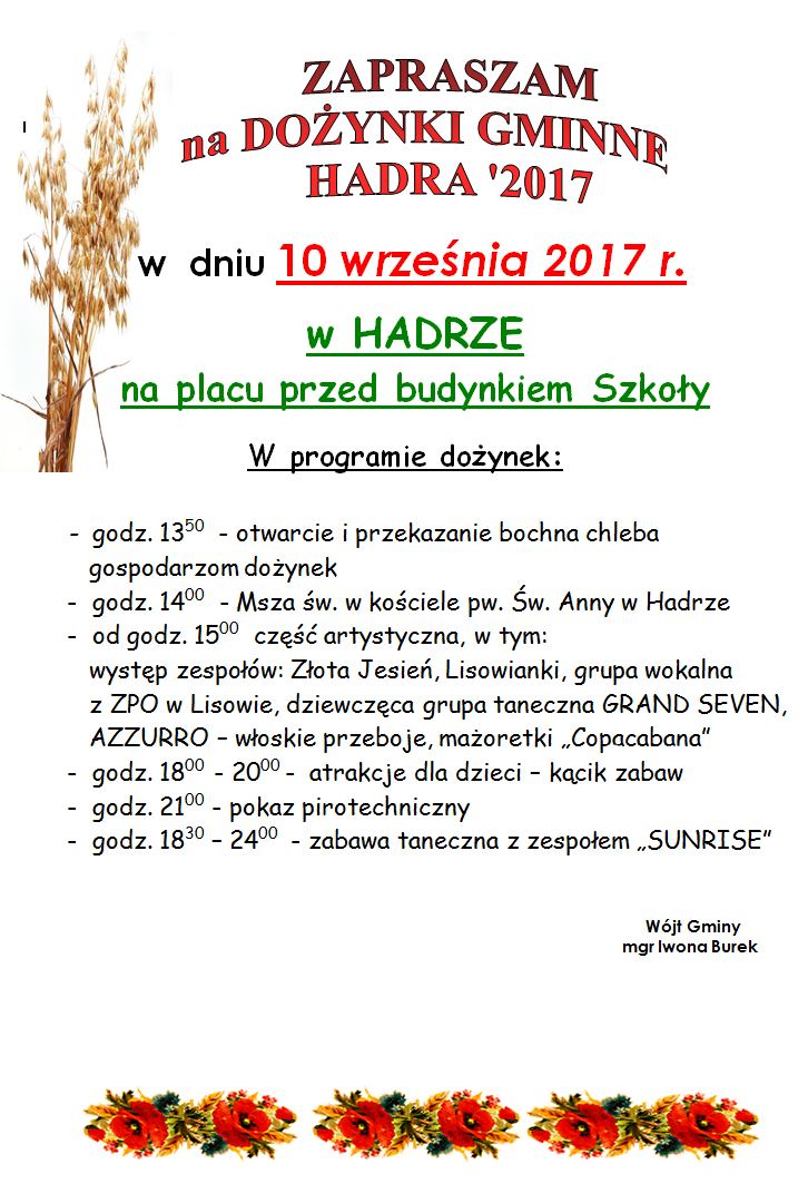 Wójt Gminy Herby zaprasza na Dożynki Gminne Hadra 2017 w dniu 10 września 2017 w Hadrze na placu przed budynkiem Szkoły.