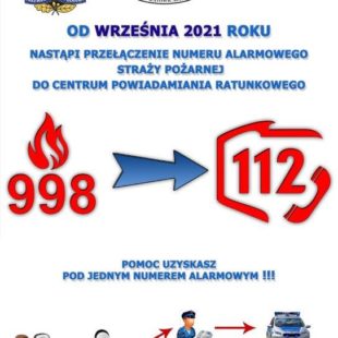 Informujemy, że od września 2021 roku nastąpi przełączenie numeru alarmowego Straży Pożarnej 998 do Centrum Powiadamiania Ratunkowego 112. Pomoc uzyskasz pod jednym numerem alarmowym. Czytaj więcej „Od września numer 998 zastąpi 112”