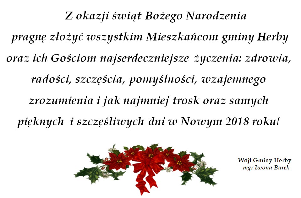 W związku z nadchodzącymi Świętami Bożego Narodzenia przekazujemy życzenia Pani Wójt Gminy Herby Mieszkańcom gminy Herby oraz ich Gościom.